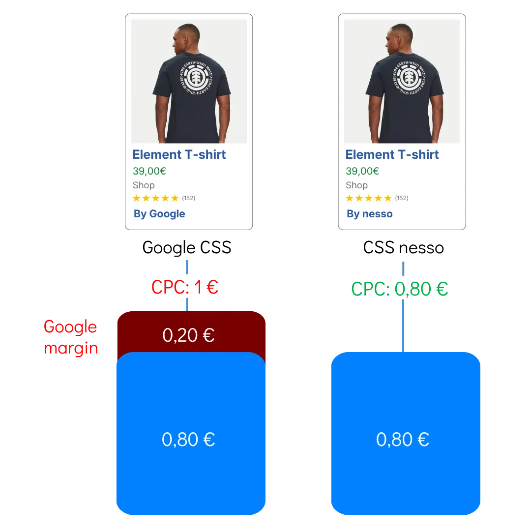 Pokud ale inzerujete přes externího CSS partnera (Evidy / nesso.digital), tato 20% marže odpadá. Váš bid jde do aukce v plné výši. Za stejnou cenu tak v aukci porážíte konkurenci, nebo naopak za stejnou pozici platíte Googlu méně.